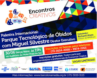 No último dia 30/06, no Auditório do Hotel Praia do Sol, mais um evento do Programa “Encontros Criativos”, onde o SEBRAE trouxe um case de sucesso do “Parque Tecnológico de Óbidos”, onde o Diretor do parque Miguel Silvestre falou das experiências vividas em Portugal, com a criação de um centro produtivo e geração de empregos através da inovação e da criatividade promovendo assim o desenvolvimento local.